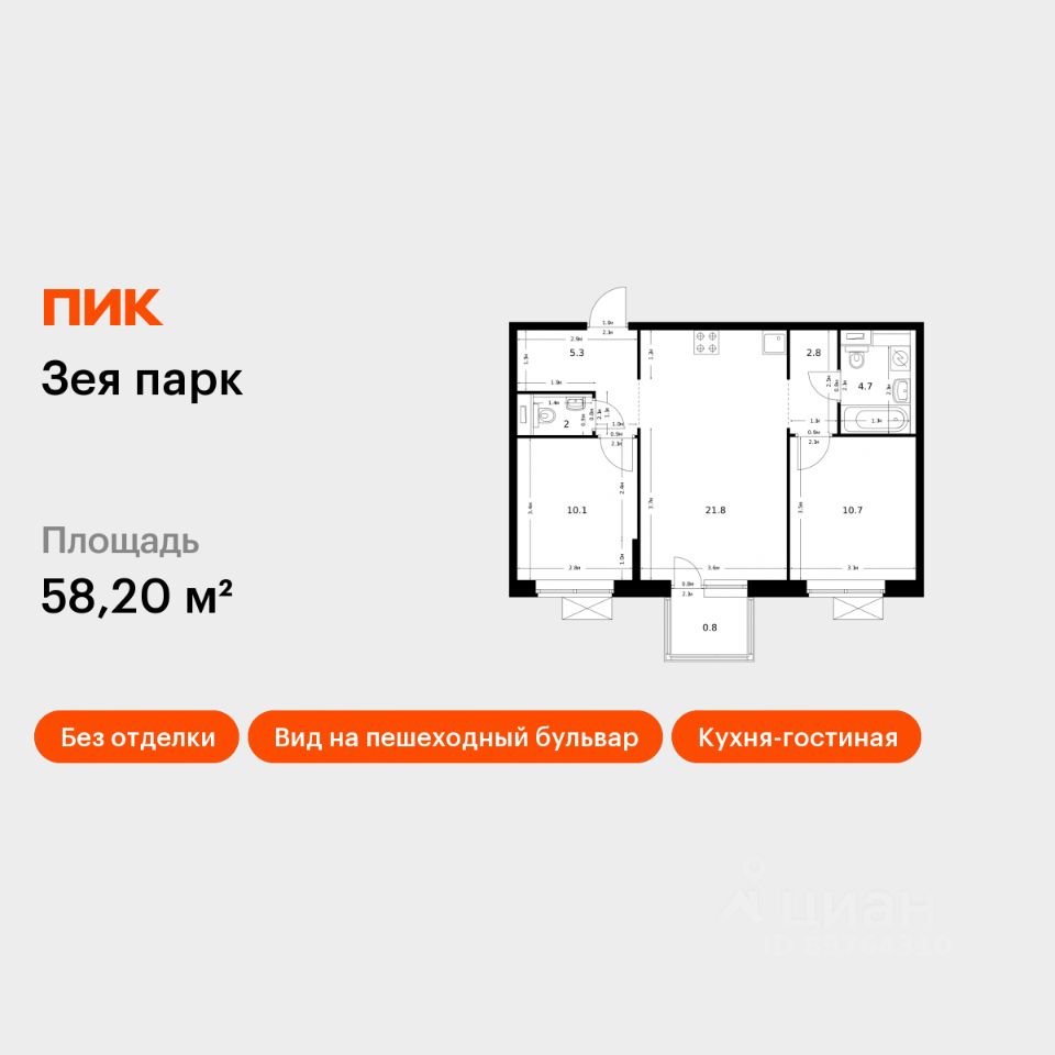 Продаётся 2-комн. квартира площадью 58,2 кв.м на 6 этаже 9 этажного дома (Корпус 3, Секция 1) проекта ПИК Зея парк. Светлый просторный подъезд на уровне земли, функциональная планировка, большие окна, без отделки. ''Зея парк'' - новый квартал со всем необходимым для комфортной жизни. До центра Благовещенска - 15 минут. Внутри ''Зея парка'' много места для тихих прогулок и активного отдыха. В каждом дворе будет парк с детскими и спортивными площадками. Рядом с домами пройдёт широкий пешеходный бульвар, где мы установим удобные скамейки и высадим кустарники и цветы и взрослые деревья. В квартиры и дворы сможет беспрепятственно проникать солнце благодаря переменной высоте корпусов - 9 и 16 этажей. В домах будут просторные и светлые подъезды с дизайнерской отделкой, витражным остеклением и двумя выходами на уровне земли: во двор и на улицу. В квартирах большие окна, застеклённые балконы и лоджии — будет светло и уютно даже зимой. Все квартиры сдаются с предчистовой отделкой: самые грязные и шумные работы к моменту выдачи ключей уже закончатся. На первых этажах домов разместятся магазины, кафе и другие сервисы, а на подземных — индивидуальные кладовые. В 1013 минутах пути на машине — парк Дружбы, аквапарк ''Плаза'' и ТРЦ ''Острова''. Рядом с жилым кварталом есть автобусная остановка, от которой можно добраться в любую часть города. Артикул 879201 (Застройщик ООО ''СЗ ''ПИК Благовещенск'')
