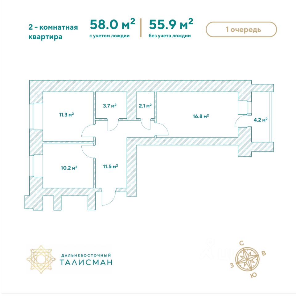 Продаётся 2-комнатная квартира в сданном доме (Партизанская, 64/2), срок сдачи: III-кв. 2025, общей площадью 57.7 кв.м., на 3 этаже. Жилой комплекс ''Дальневосточный Талисман'' расположен в 93 квартале Благовещенска.