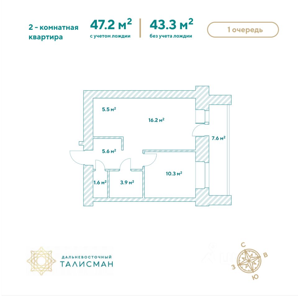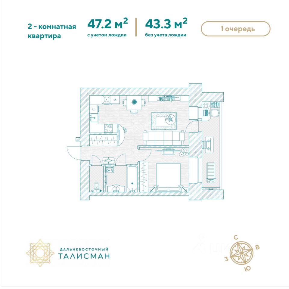 Продаётся 2-комнатная квартира в сданном доме (Партизанская, 64/2), срок сдачи: III-кв. 2025, общей площадью 46.9 кв.м., на 6 этаже. Жилой комплекс ''Дальневосточный Талисман'' расположен в 93 квартале Благовещенска.