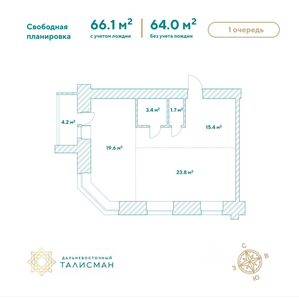 Продаётся квартира свободной планировки в сданном доме (Партизанская, 64/2), срок сдачи: III-кв. 2025, общей площадью 66 кв.м., на 7 этаже. Жилой комплекс ''Дальневосточный Талисман'' расположен в 93 квартале Благовещенска.