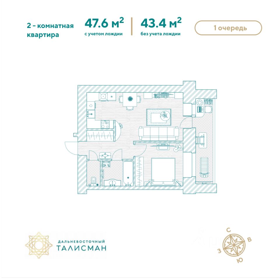 Продаётся 2-комнатная квартира в сданном доме (Партизанская, 64/2), срок сдачи: III-кв. 2025, общей площадью 47.7 кв.м., на 10 этаже. Жилой комплекс ''Дальневосточный Талисман'' расположен в 93 квартале Благовещенска.