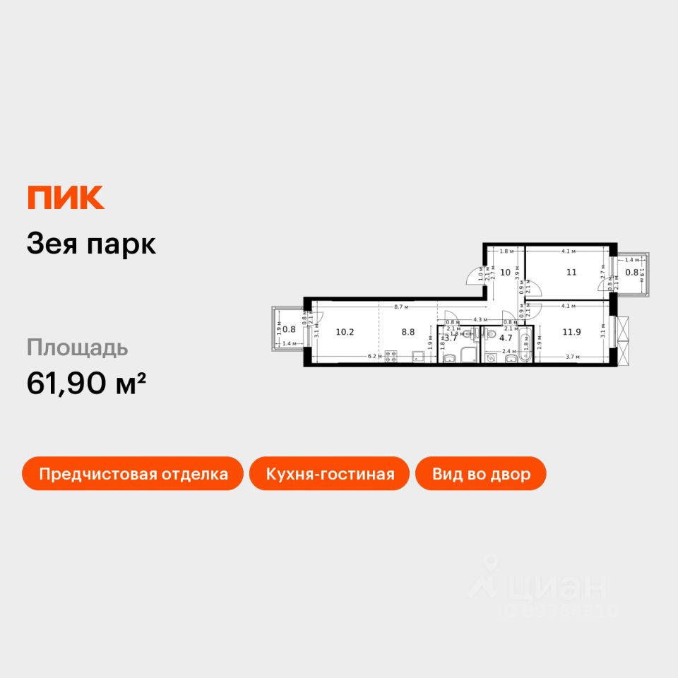 Продаётся 2-комн. квартира площадью 61,9 кв.м на 6 этаже 9 этажного дома (Корпус 1, Секция 2) проекта ПИК Зея парк. Светлый просторный подъезд на уровне земли, функциональная планировка, большие окна, предчистовая отделка.