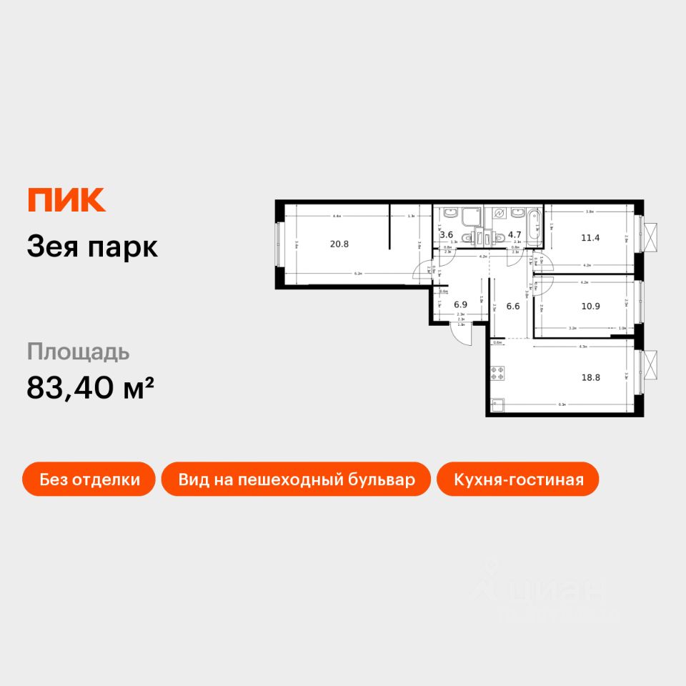 Продаётся 3-комн. квартира площадью 83,4 кв.м на 9 этаже 9 этажного дома (Корпус 3, Секция 2) проекта ПИК Зея парк. Светлый просторный подъезд на уровне земли, функциональная планировка, большие окна, без отделки.