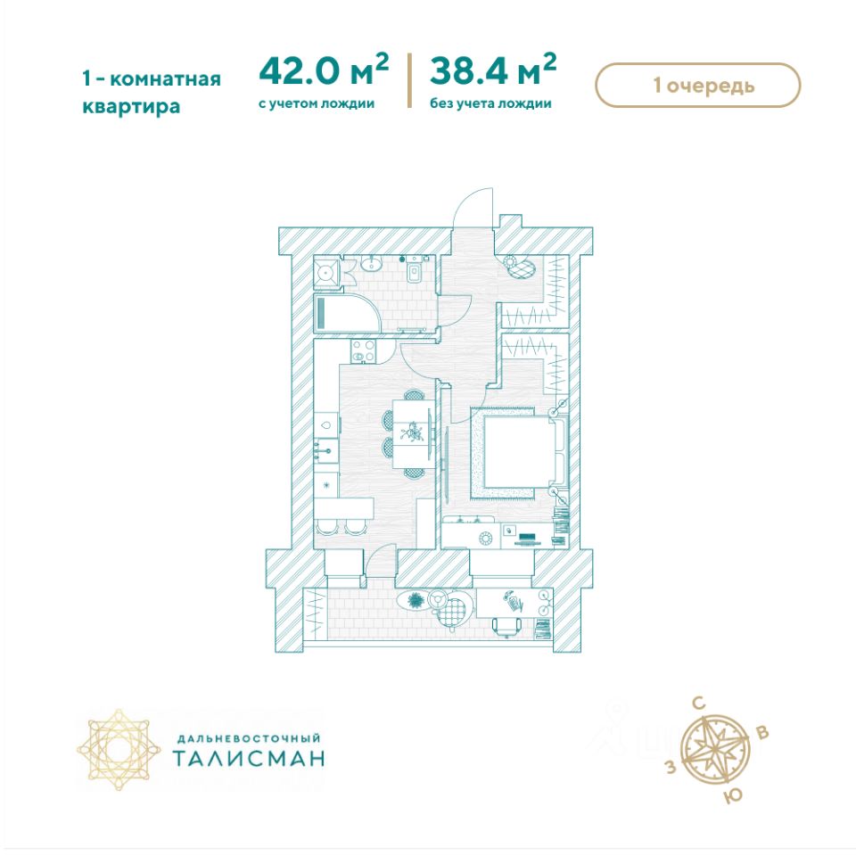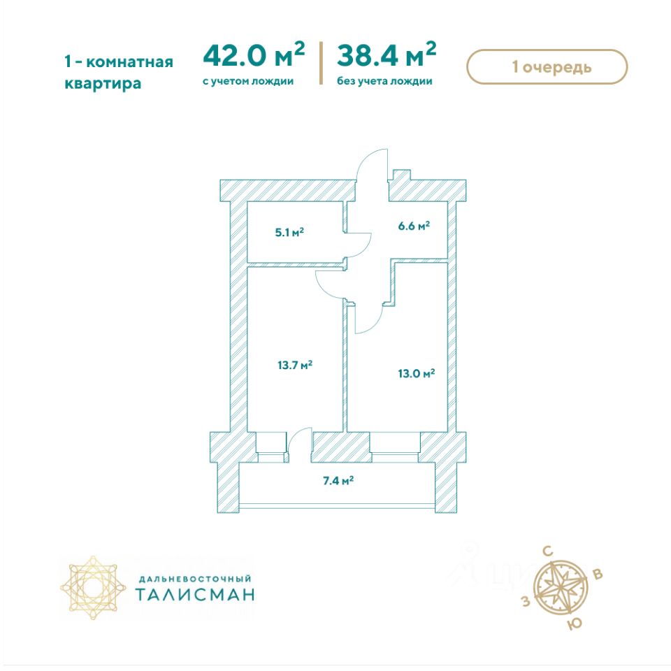 Продаётся 1-комнатная квартира в сданном доме (Партизанская, 64/2), срок сдачи: III-кв. 2025, общей площадью 42.1 кв.м., на 6 этаже. Жилой комплекс ''Дальневосточный Талисман'' расположен в 93 квартале Благовещенска.