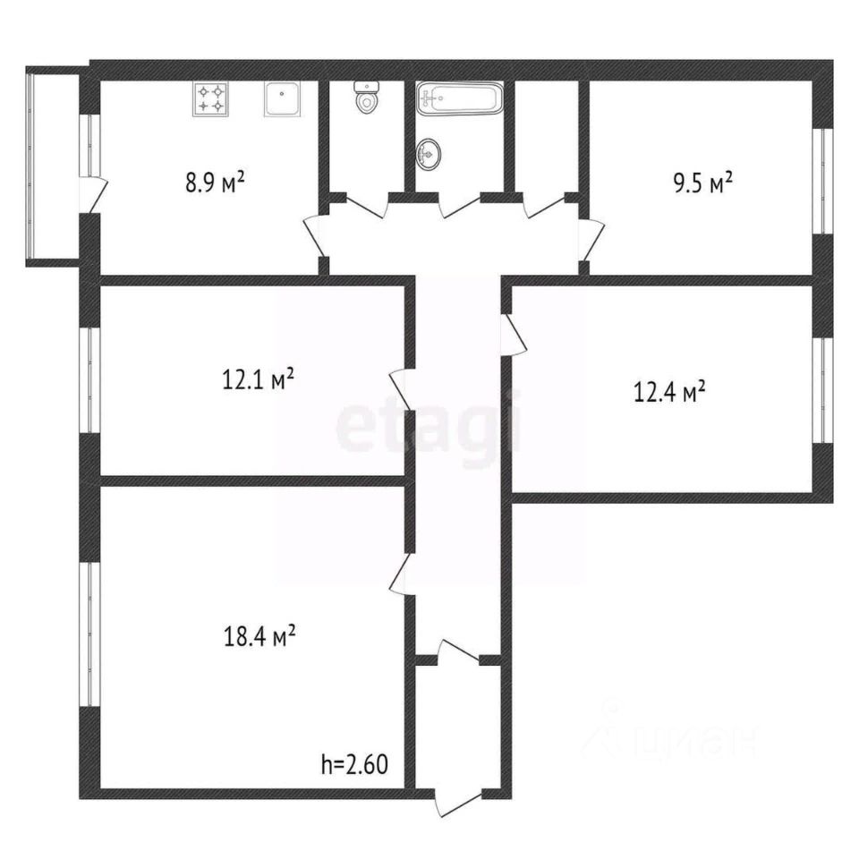 4-ех комнатная квартира в развитом районе города Этаж третий Стороны света Север, Юг Площадь 79,3 м² Кухня 8,9 м² Балкон застеклен Комната 18,4 м² Спальня 1 12,1 м² Спальня 2 9,5 м² Спальня 3 - 12,4 м² Комнаты раздельные, Санузел раздельный, кафель Окна металло-пластиковые Плита электро Батареи чугун, увеличенное количество секций.