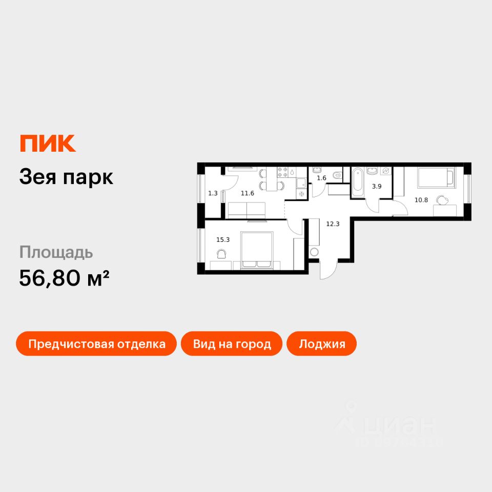 Продаётся 2-комн. квартира площадью 56,8 кв.м на 1 этаже 9 этажного дома (Корпус 7, Секция 1) проекта ПИК Зея парк. Светлый просторный подъезд на уровне земли, функциональная планировка, большие окна, предчистовая отделка.