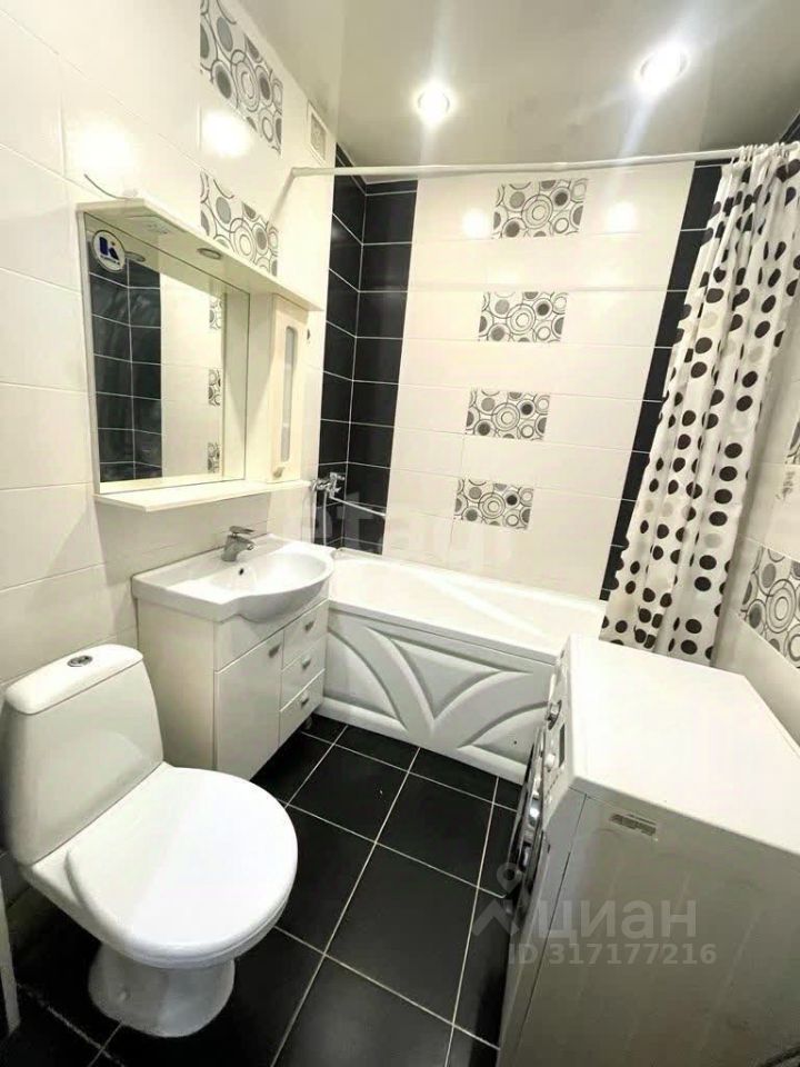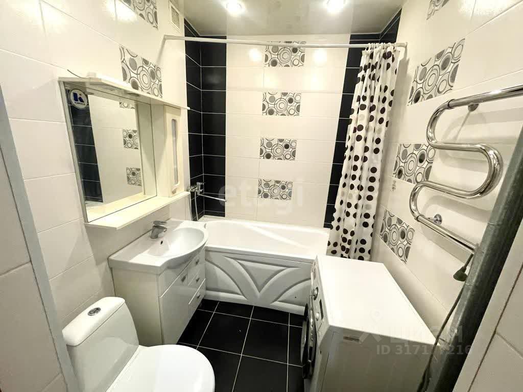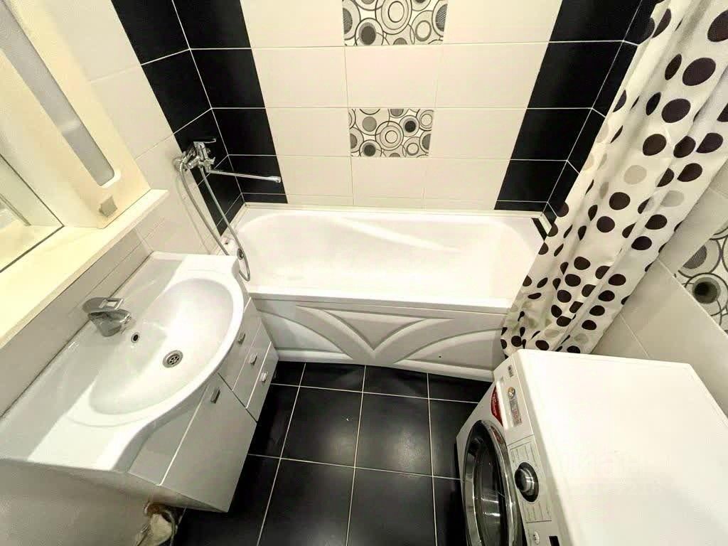 Санузел совмещённый, отделан кафельной плиткой, стиральная машина установлена.