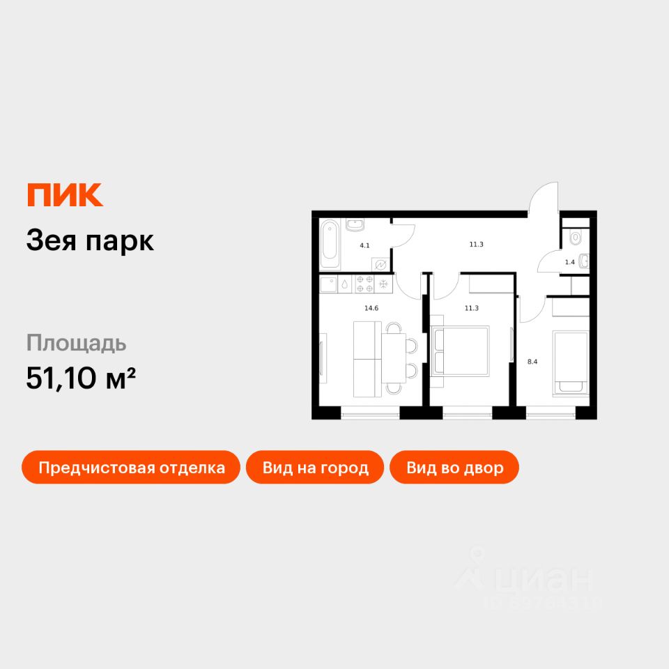 Продаётся 2-комн. квартира площадью 51,1 кв.м на 1 этаже 9 этажного дома (Корпус 7, Секция 1) проекта ПИК Зея парк. Светлый просторный подъезд на уровне земли, функциональная планировка, большие окна, предчистовая отделка.