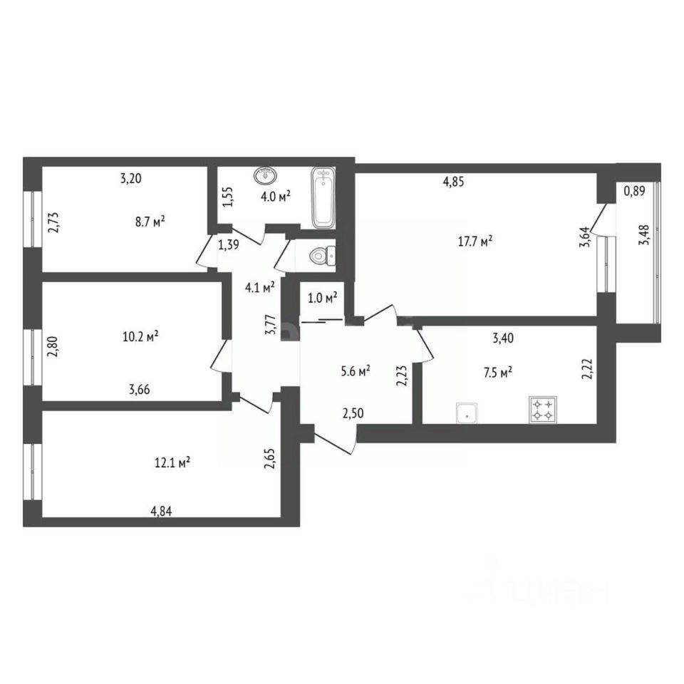Три отдельные спальни (9, 10, 12 м2), кухня (7,5 м2), большой зал (18 м2), большая ванная (4 м2), много шкафов, лоджия, высота потолков 2,5 м. Перепланировка санузла узаконена.