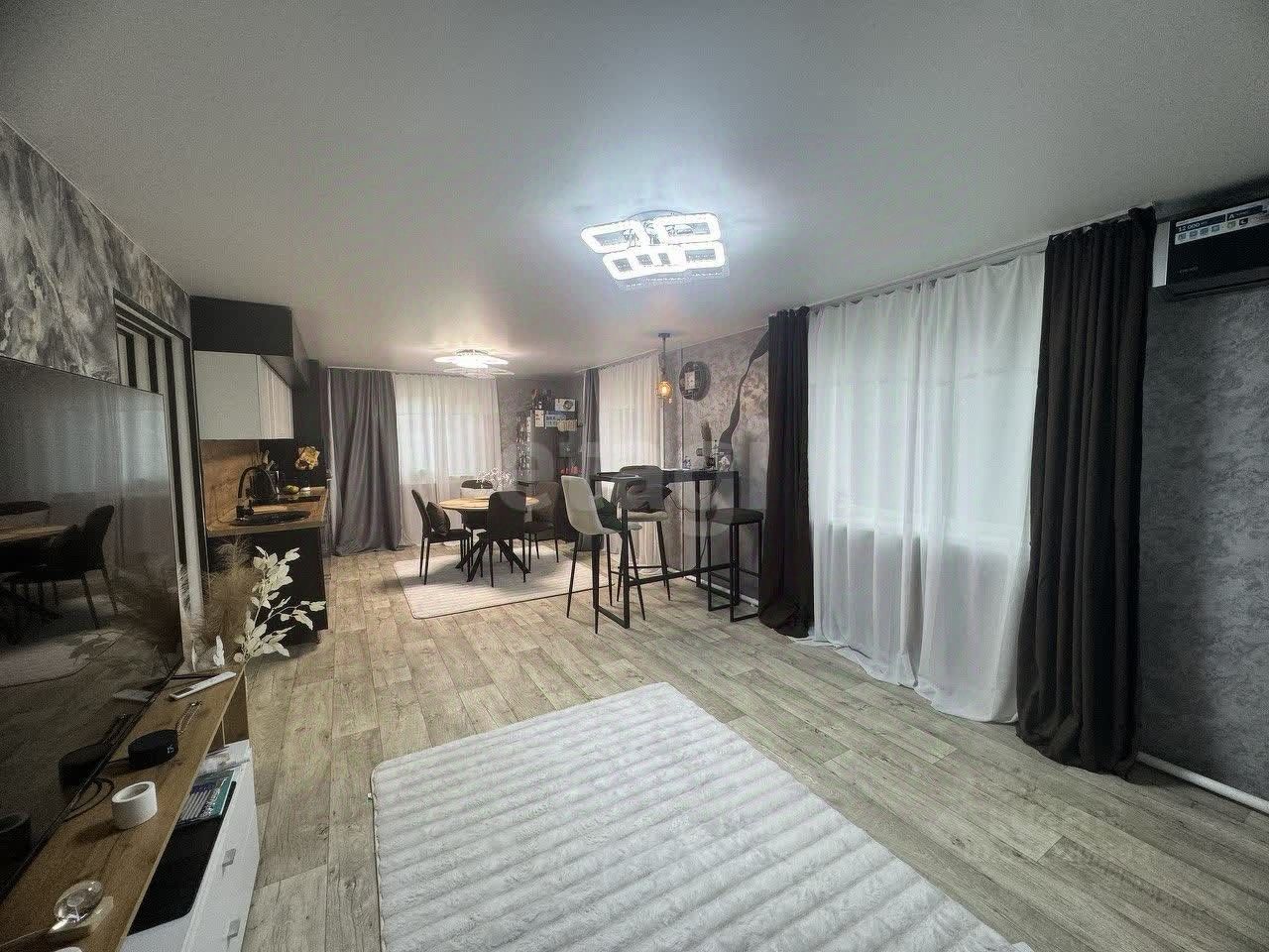**Отделка и интерьер:** * **Материалы:** Использованы дорогие и качественные материалы: кварцвиниловый ламинат (влагостойкий, износостойкий), декоративная штукатурка. * **Мебель и техника:** Вся мебель и техника **НОВЫЕ**, установлены при ремонте в 2025 году. Включены в стоимость **2 кондиционера** для комфорта в любое время года. * **Планировка:** Продуманная и удобная. Санузел **раздельный**, установлена современная душевая кабина.