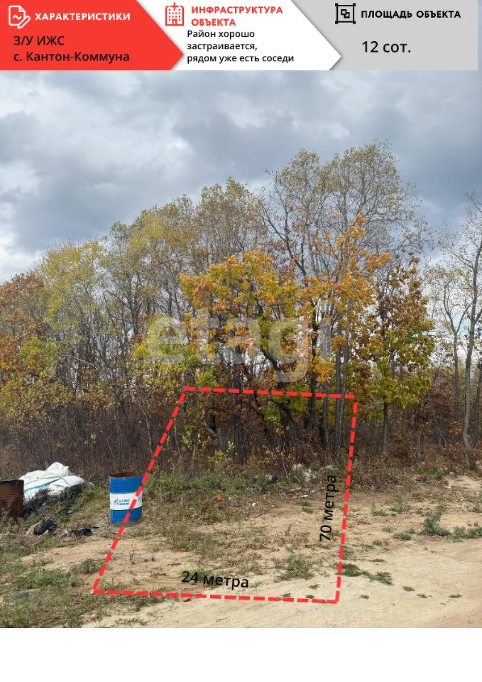 В продаже участок ИЖС с. Кантон-Коммуна, 12.05 соток. Участок не расчищен. Один собственник, без обременений. Хорошее месторасположение, тихий район, чистый воздух. Участок находится всего в 13 км от города. Дорога без пробок. Данный участок подходит под льготную ипотеку. Документы готовы к продаже. с. Кантон-Коммуна хорошо застраивается. Федеральное агентство недвижимости ''Этажи'' входит в состав ''Гильдии Риэлторов Приамурья''. От нас вы получаете полное юридическое сопровождение, бесплатные консультации по ипотечному кредитованию и его оформлению, с нами ставки по ипотеке ниже от банков-партнёров, процент одобряемости выше, быстрые сроки рассмотрения, также возможна подача документов в МФЦ для регистрации права собственности, всё это возможно напрямую в офисе компании ''Этажи'' (Калинина 52).