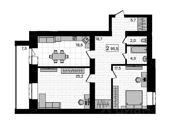 Площадь квартиры с холодными помещениями, 95,5 кв.м., Площадь квартиры без холодных помещений, 92,6 кв.м., Жилая площадь, комнаты, 42,7 (17,5+25,2) кв.м., Кухня, 18,60 кв.м., Прихожая, 5,70+18,70 кв.м., сан узел раздельный (6,30) 2,00 +4,30 кв.м., Лоджия, 7,30 кв.м.,
