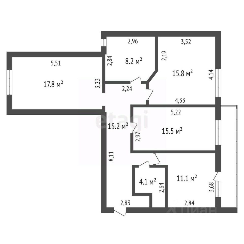 • Общая площадь составляет 90 кв.м: - кухня 11,1 кв.м., три изолированные комнаты 15,5/15,8/17,8 кв.м. Квартира расположена на золотом 3 этаже и имеет прекрасную планировку.