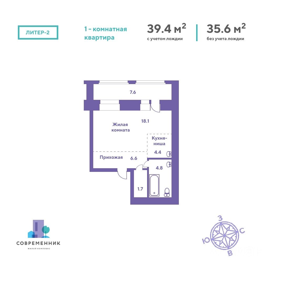 Общая площадь39,4 м2